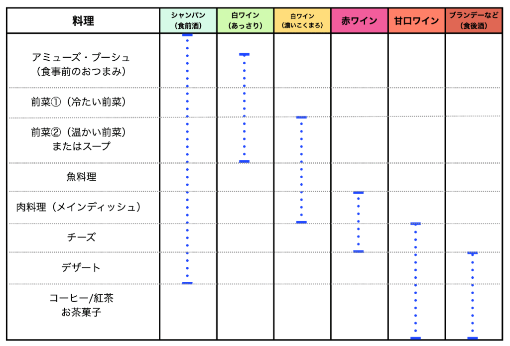 以下は、一般的なコース料理の流れと、それぞれの料理に合わせるワイン&飲むタイミングのセオリーです。